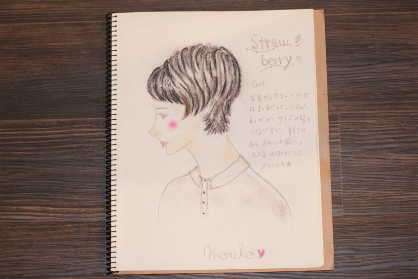 熟していないイチゴの様に、さっぱりしとしたクールな感じを襟足のスッキリしたラインで、甘くなり過ぎないように調節。