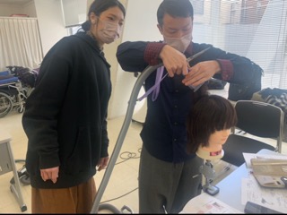 今日は実際にお客様のご自宅や、ベッドの上でカットをすることになった時を想定した授業でした