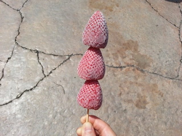 暑さにやられて凍らした苺を食べます。