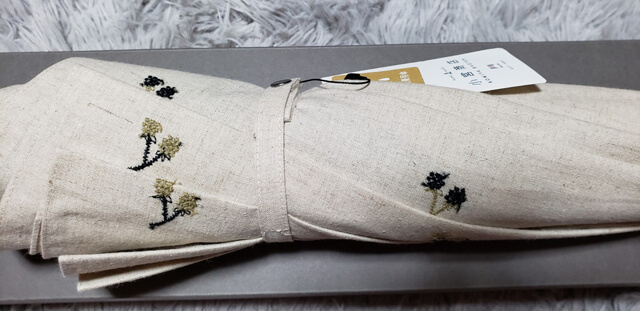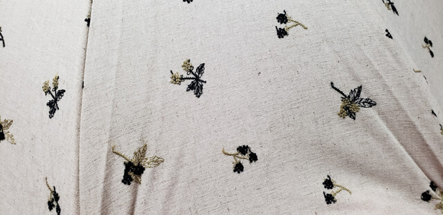 天然素材の花柄刺繍生地を表に、細かいギンガムチェックの生地を裏にして