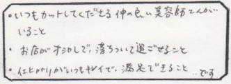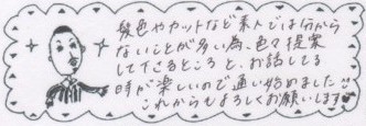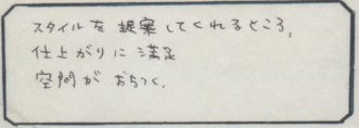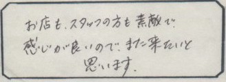 ご来店されたお客様の声をご紹介。率直な感想やリアルな評価をご覧いただき、 画像だけでは伝わらないお店の雰囲気がお伝えできればと思います。