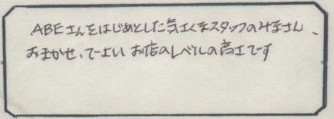 ご来店されたお客様の声をご紹介。率直な感想やリアルな評価をご覧いただき、 画像だけでは伝わらないお店の雰囲気がお伝えできればと思います。