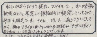 ご来店されたお客様の声をご紹介。率直な感想やリアルな評価をご覧いただき、 画像だけでは伝わらないお店の雰囲気がお伝えできればと思います。