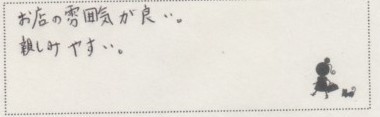 ご来店されたお客様の声をご紹介。率直な感想やリアルな評価をご覧いただき、 画像だけでは伝わらないお店の雰囲気がお伝えできればと思います。